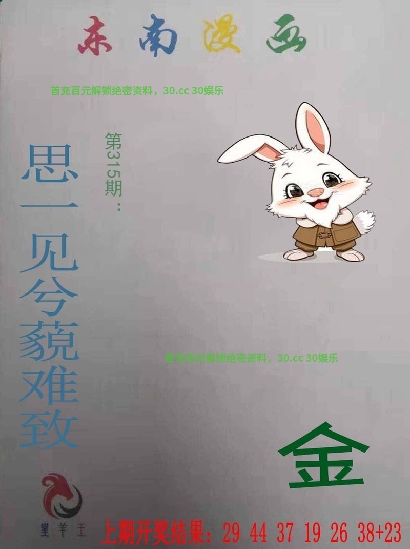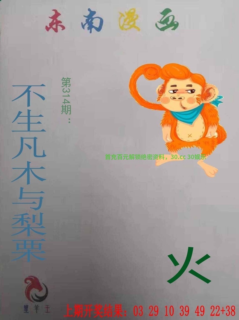 315期:今期生肖一八开,穿金戴银戴兰花。今期特尾二三七,三八三九还要防。风流才子俏佳人,玄机道破点三二。买了一六出二九,森林之中它为王。 |