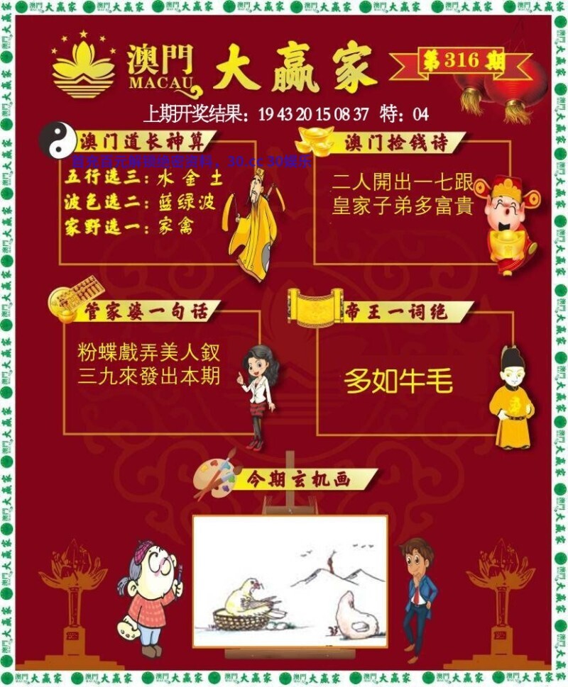 | 315期九肖 | 马猪猴鸡虎兔狗牛羊 | 开:虎04 |